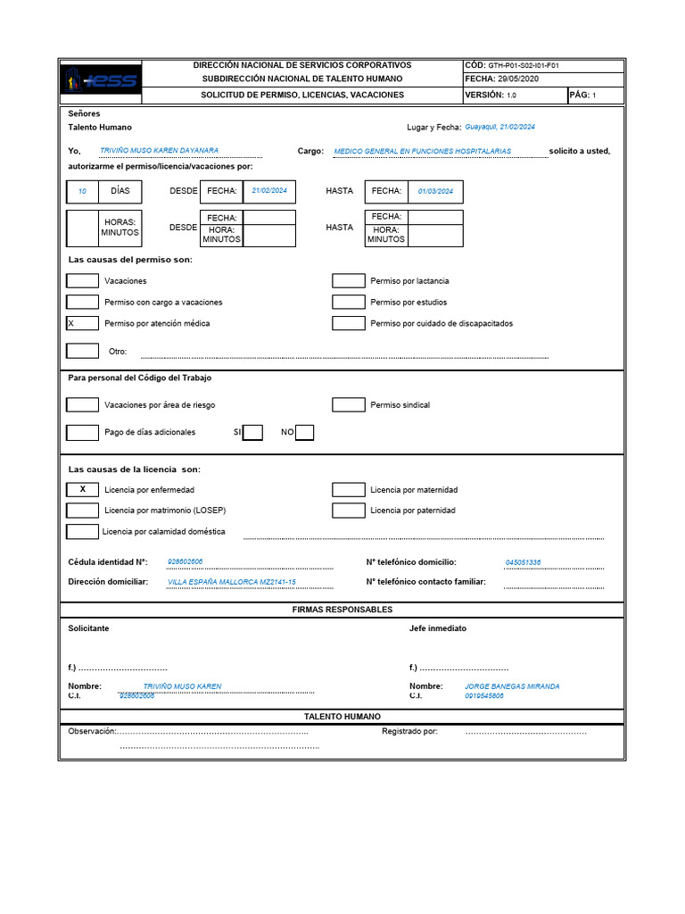 Yo, TRIVIÑO MUSO KAREN DAYANARA Cargo: MEDICO GENERAL EN FUNCIONES HOSPITALARIAS solicito a usted,