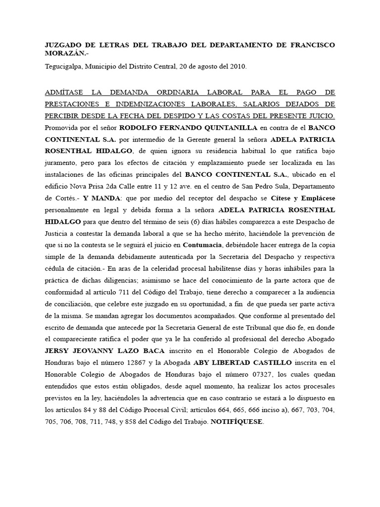 Promovida por el señor RODOLFO FERNANDO QUINTANILLA en contra de el BANCO