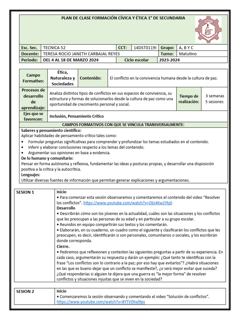 PLAN DE CLASE FORMACIÓN CÍVICA Y ÉTICA 1° DE SECUNDARIA