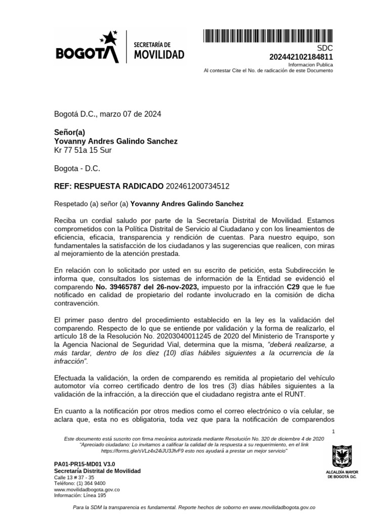 Reciba un cordial saludo por parte de la Secretaría Distrital de Movilidad. Estamos