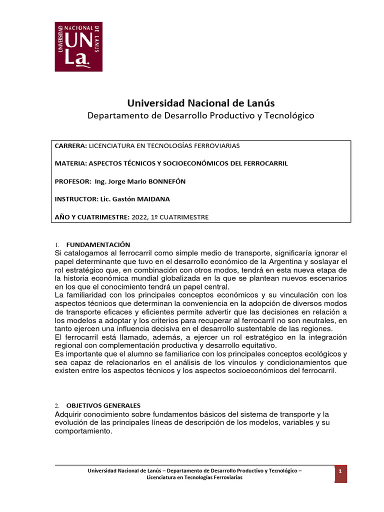 MATERIA: ASPECTOS TÉCNICOS Y SOCIOECONÓMICOS DEL FERROCARRIL