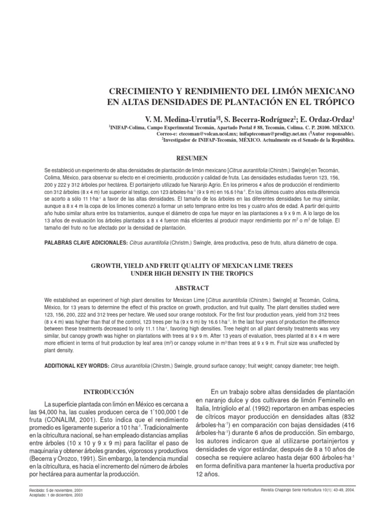 We established an experiment of high plant densities for Mexican Lime [Citrus aurantifolia (Chirstm.) Swingle] at Tecomán, Colima,