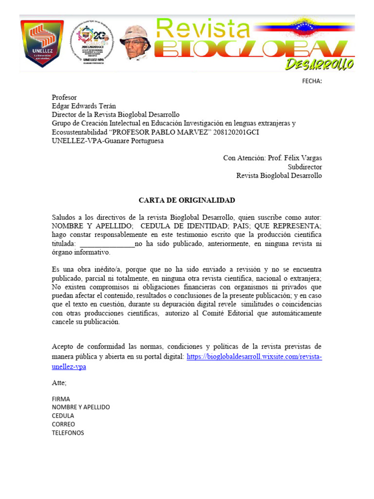 Saludos a los directivos de la revista Bioglobal Desarrollo, quien suscribe como autor: