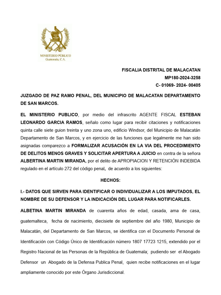 graves y por requerida la apertura a juicio en contra de la señora ALBERTINA MARTIN