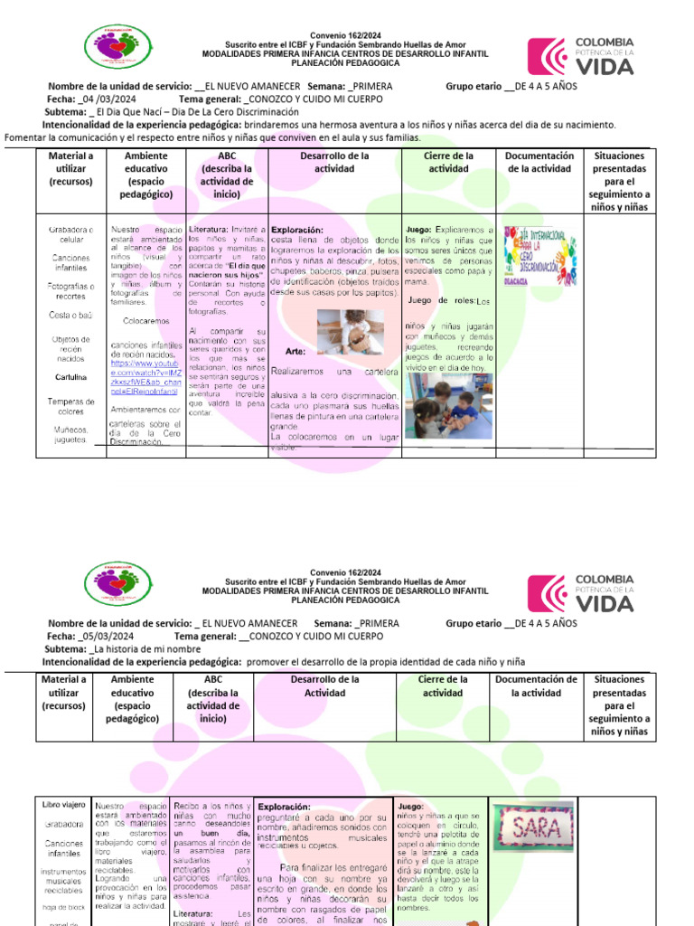 Nombre de la unidad de servicio: _EL NUEVO AMANECER Semana: _PRMERA Grupo etario _DE 4 A 5 AÑOS