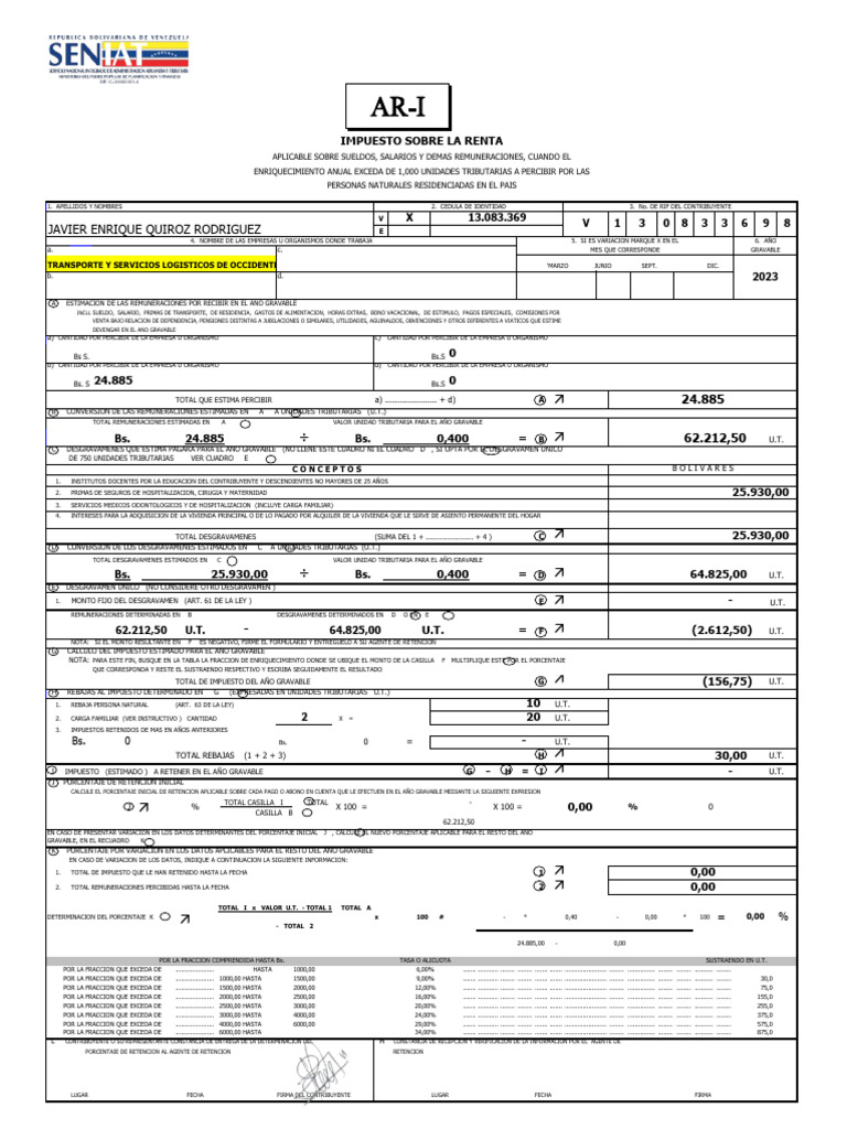 1. APELLIDOS Y NOMBRES 2. CEDULA DE IDENTIDAD 3. No. DE RIF DEL CONTRIBUYENTE
