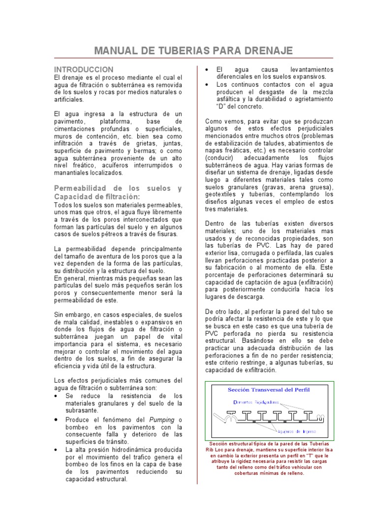 Como vemos, para evitar que se produzcan algunos de estos efectos perjudiciales mencionados entre muchos otros (problemas de estabilizacin de taludes, abatimientos de napas freticas, etc.) es necesario controlar (conducir) adecuadamente los flujos subterrneos de agua. Hay varias formas de disear un sistema de drenaje, ligadas desde luego a diferentes materiales tales como suelos granulares (gravas, arena gruesa), geotextiles y tuberas, contemplando los diseos algunas veces el empleo de estos tres materiales. Dentro de las tuberas existen diversos materiales; uno de los materiales mas usados y de reconocidas propiedades, son las tuberas de PVC. Las hay de pared exterior lisa, corrugada o perfilada, las cuales llevan perforaciones practicadas posterior a su fabricacin o al momento de ella. Este porcentaje de perforaciones determinar su capacidad de captacin de agua (exfiltracin) para posteriormente conducirla hacia los lugares de descarga. De otro lado, al perforar la pared del tubo se podra afectar la resistencia de este y lo que se busca en este caso es que una tubera de PVC perforada no pierda su resistencia estructural. Basndose en ello se debe practicar una adecuada distribucin de las perforaciones a fin de no perder resistencia; este criterio restringe, a algunas tuberas, su capacidad de exfiltracin.