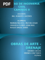 El drenaje es el proceso mediante el cual el agua de filtracin o subterrnea es removida de los suelos y rocas por medios naturales o artificiales. El agua ingresa a la estructura de un pavimento, plataforma, base de cimentaciones profundas o superficiales, muros de contencin, etc. bien sea como infiltracin a travs de grietas, juntas, superficie de pavimento y bermas; o como agua subterrnea proveniente de un alto nivel fretico, acuferos interrumpidos o manantiales localizados. El agua causa levantamientos diferenciales en los suelos expansivos. Los continuos contactos con el agua producen el desgaste de la mezcla asfltica y la durabilidad o agrietamiento D del concreto.
