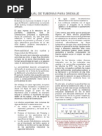 Tejido : Porcentaje de rea abierta 4% No tejido : Porosidad 30% Los geotextiles en general se usan para drenaje superficial pueden ser usados como cubierta o envoltura de drenes de zanja, un forro de las tuberas de drenaje o un filtro de la capa de drenaje. 2.3. LAS TUBERIAS Las tuberas a ser usadas para subdrenaje pueden ser fabricadas de concreto, arcilla, fibra bitumizada, metal o plsticos variados con superficie lisa o corrugada. Cuando sean usados como drenajes enterrados, mayormente son perforados o ranurados y algunos con juntas abiertas, de tal manera que el agua pueda fluir libremente hacia el interior de las tuberas. Las tuberas de salida deben estar instaladas en intervalos convenientes para conducir el agua recolectada hacia un punto de salida apropiado y seguro. La salida debe estar protegida de riesgos naturales u ocasionados por el hombre.