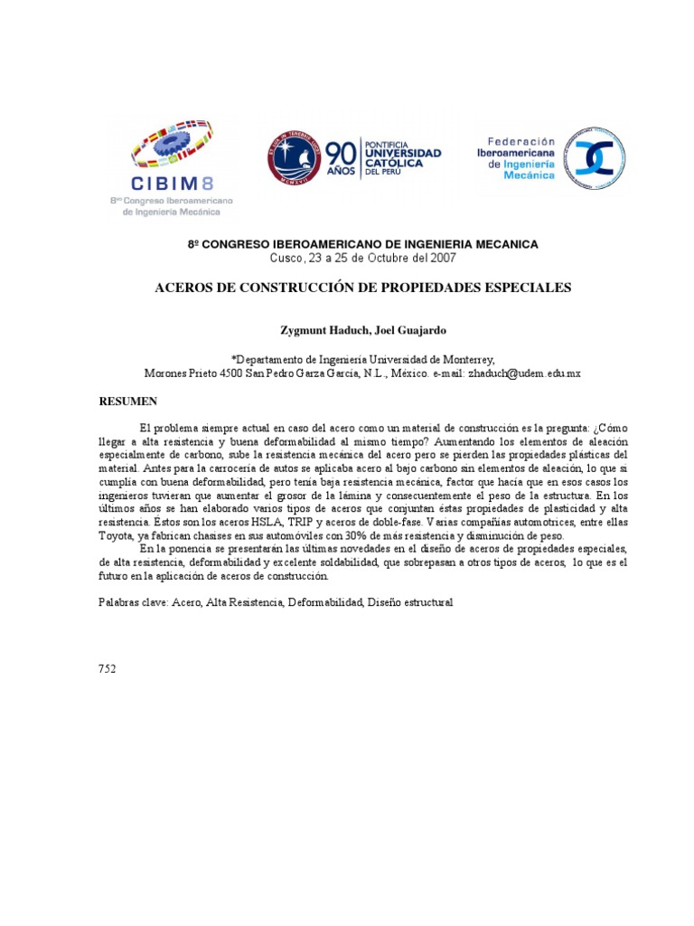 Zygmunt Haduch, Joel Guajardo *Departamento de Ingeniera Universidad de Monterrey, Morones Prieto 4500 San Pedro Garza Garca, N.L., Mxico. e-mail: zhaduch@udem.edu.mx RESUMEN El problema siempre actual en caso del acero como un material de construccin es la pregunta: Cmo llegar a alta resistencia y buena deformabilidad al mismo tiempo? Aumentando los elementos de aleacin especialmente de carbono, sube la resistencia mecnica del acero pero se pierden las propiedades plsticas del material. Antes para la carrocera de autos se aplicaba acero al bajo carbono sin elementos de aleacin, lo que si cumpla con buena deformabilidad, pero tena baja resistencia mecnica, factor que haca que en esos casos los ingenieros tuvieran que aumentar el grosor de la lmina y consecuentemente el peso de la estructura. En los ltimos aos se han elaborado varios tipos de aceros que conjuntan stas propiedades de plasticidad y alta resistencia. stos son los aceros HSLA, TRIP y aceros de doble-fase. Varias compaas automotrices, entre ellas Toyota, ya fabrican chasises en sus automviles con 30% de ms resistencia y disminucin de peso. En la ponencia se presentarn las ltimas novedades en el diseo de aceros de propiedades especiales, de alta resistencia, deformabilidad y excelente soldabilidad, que sobrepasan a otros tipos de aceros, lo que es el futuro en la aplicacin de aceros de construccin. Palabras clave: Acero, Alta Resistencia, Deformabilidad, Diseo estructural