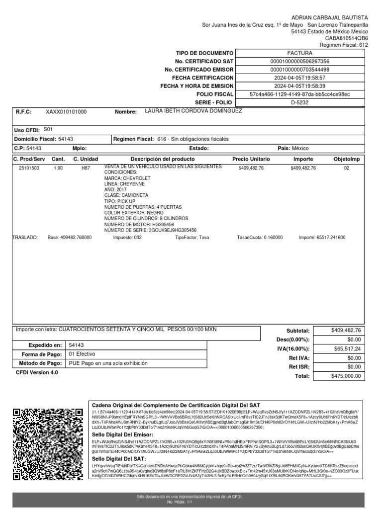25101503 1.00 H87 VENTA DE UN VEHICULO USADO EN LAS SIGUIENTES $409,482.76 $409,482.76 02