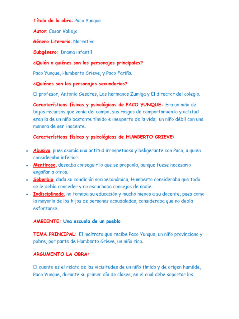 TEMA PRINCIPAL: El maltrato que recibe Paco Yunque, un niño provinciano y