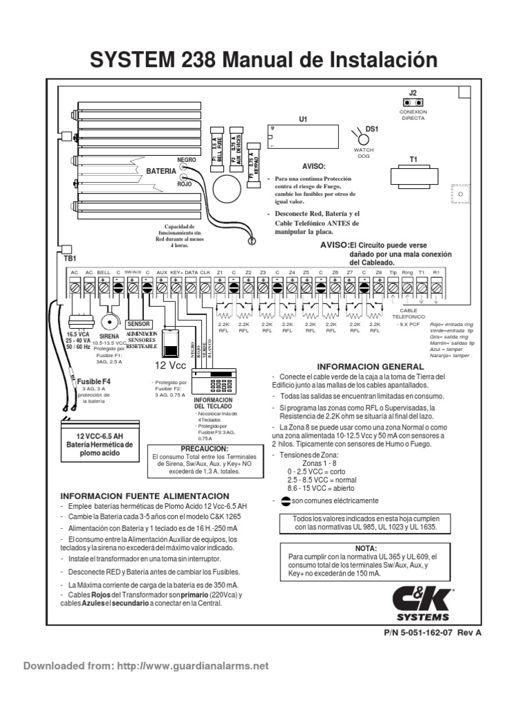 Rpida Informacin sobre este Manual Este manual contiene informacin de programacin e instalacin bsica para la Central SYSTEM 238. Para ms informacin sobre el uso y programacin de la central, consulte el Manual del Teclado Alfanumrico o el Manual de Operacin de Commander II/Monitor II. Precisin Este manual ha sido cuidadosamente revisado. Sin embargo, C&K SYSTEMS no asume responsabilidades por inexactitudes o acciones resultantes del uso de este manual. Adems, C&K se reserva el derecho de modificar el hardware o software de la SYSTEM 238 sin previo aviso. Programacin de Zonas ZONA DE FUEGO
