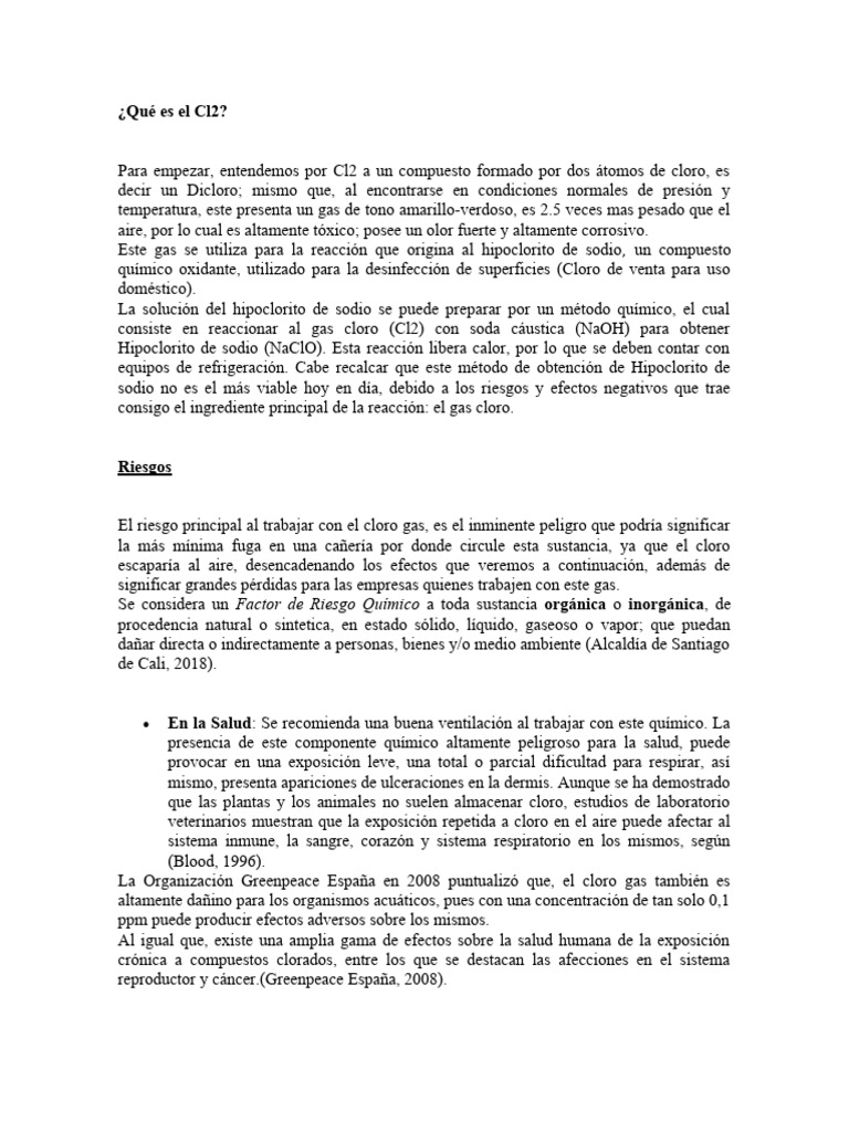 efectos que van desde leves hasta letales. Este gas se usa para la elaboración de hipoclorito