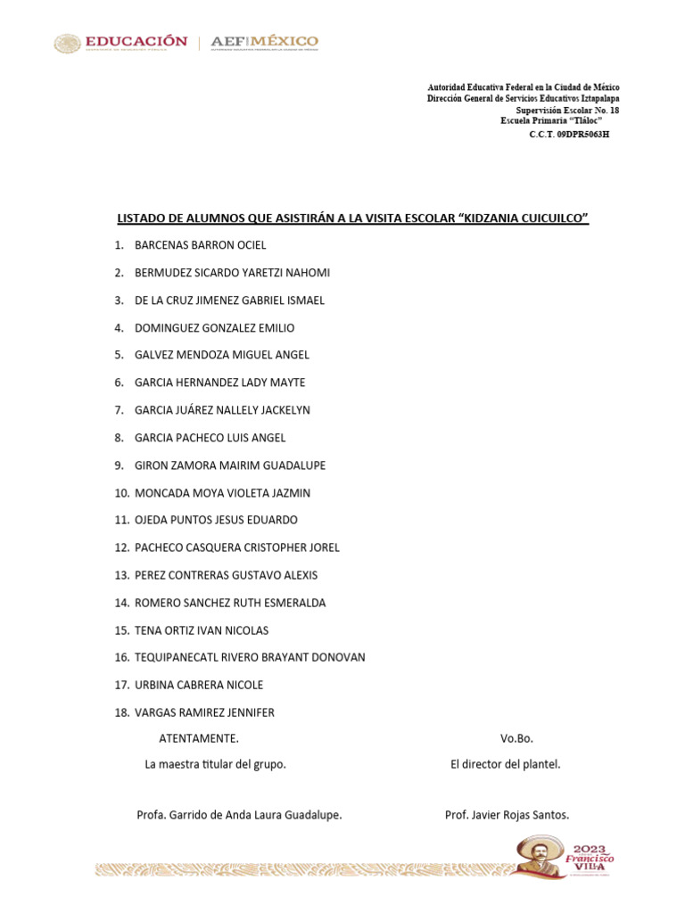 LISTADO DE ALUMNOS QUE ASISTIRÁN A LA VISITA ESCOLAR “KIDZANIA CUICUILCO”