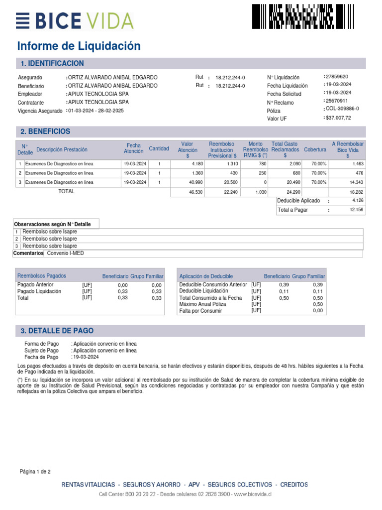 Asegurado : ORTIZ ALVARADO ANIBAL EDGARDO Rut : 18.212.244-0 N° Liquidación : 27859620