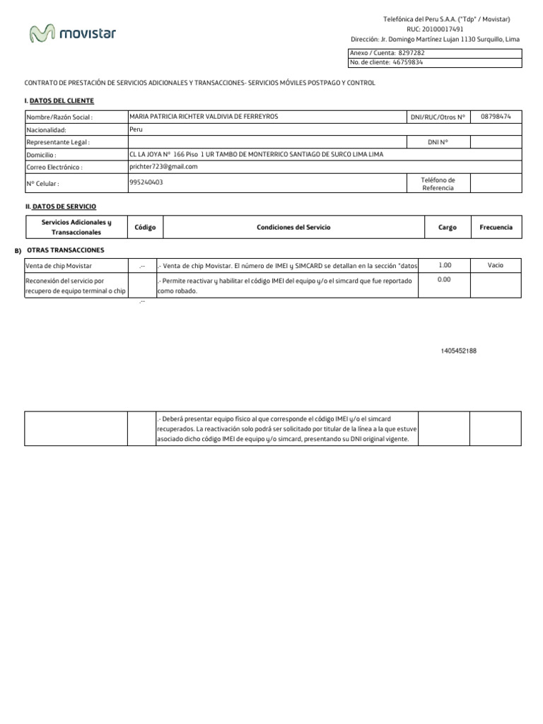 Nombre/Razón Social : MARIA PATRICIA RICHTER VALDIVIA DE FERREYROS DNI/RUC/Otros N° 08798474