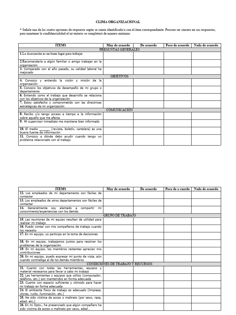 El presente inventario pretende medir el clima organizacional. Consta de una serie de