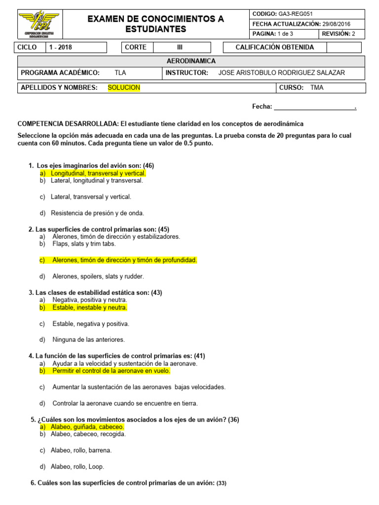 1. Los ejes imaginarios del avión son: (46)