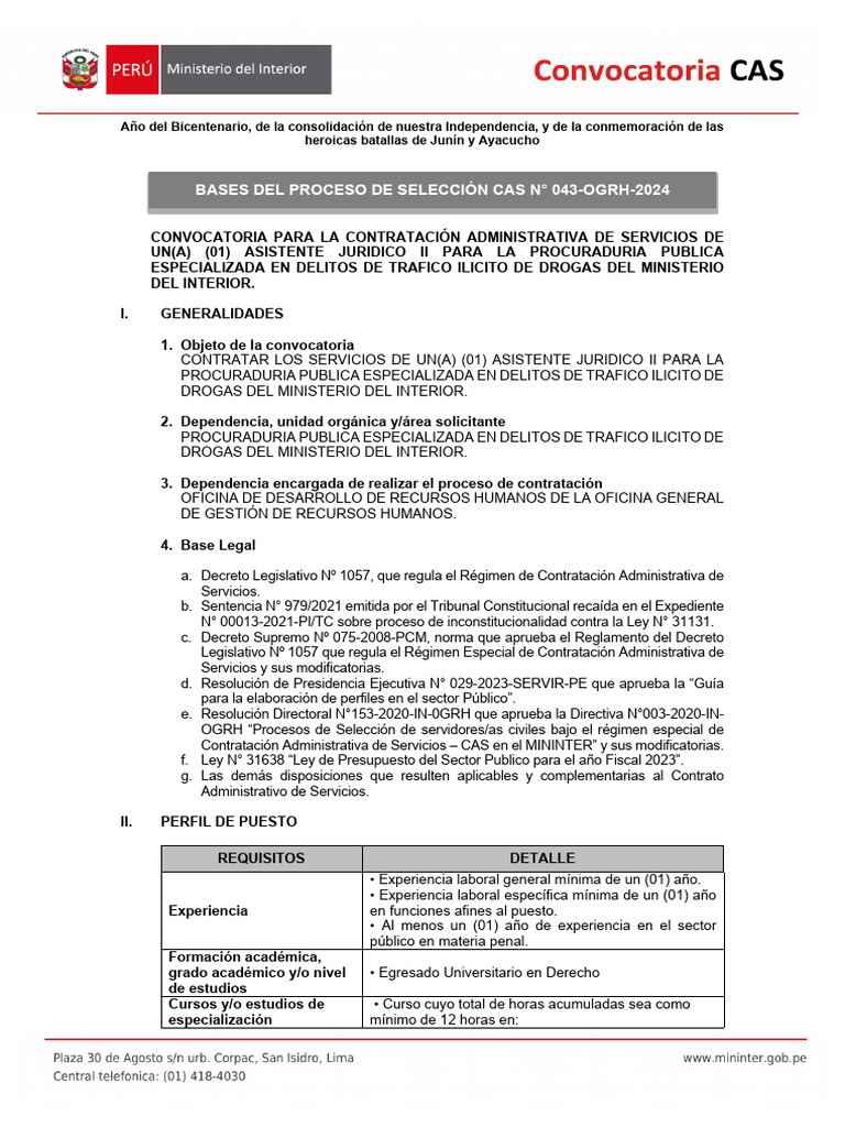 BASES DEL PROCESO DE SELECCIÓN CAS N° 043-OGRH-2024