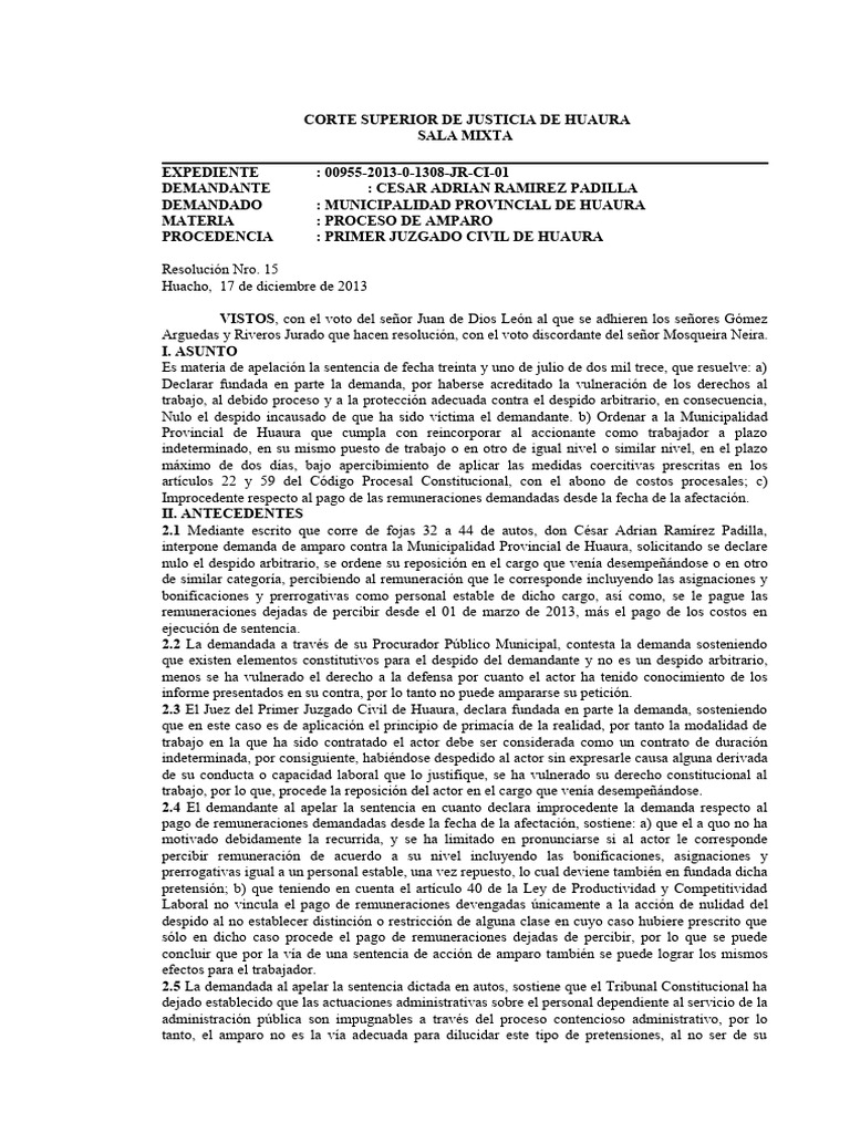 Ramírez Padilla, con la Municipalidad Provincial de Huaura, sobre proceso de amparo por