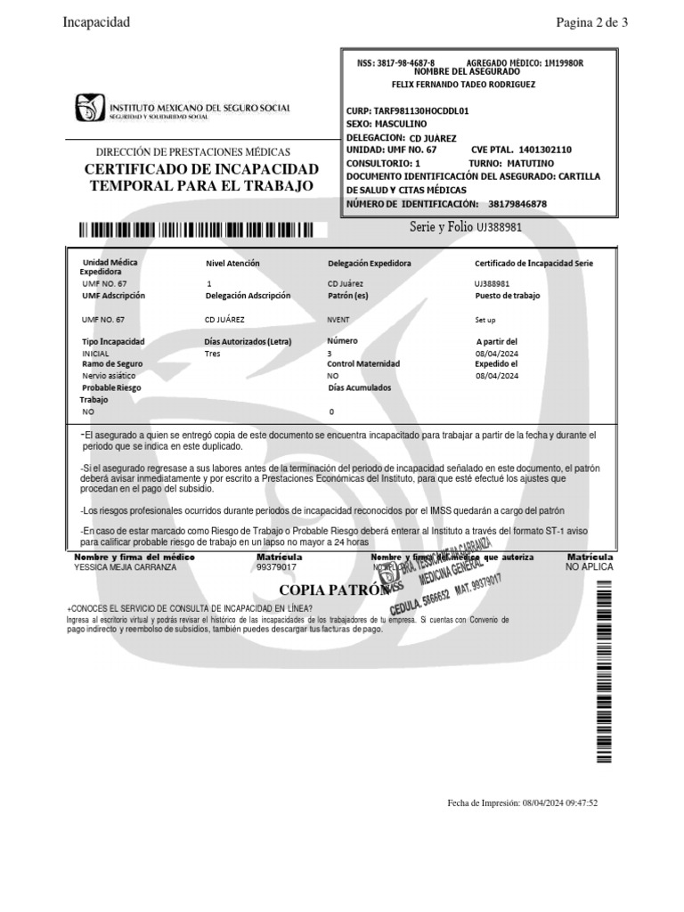 -El asegurado a quien se entregó copia de este documento se encuentra incapacitado para trabajar a partir de la fecha y durante el