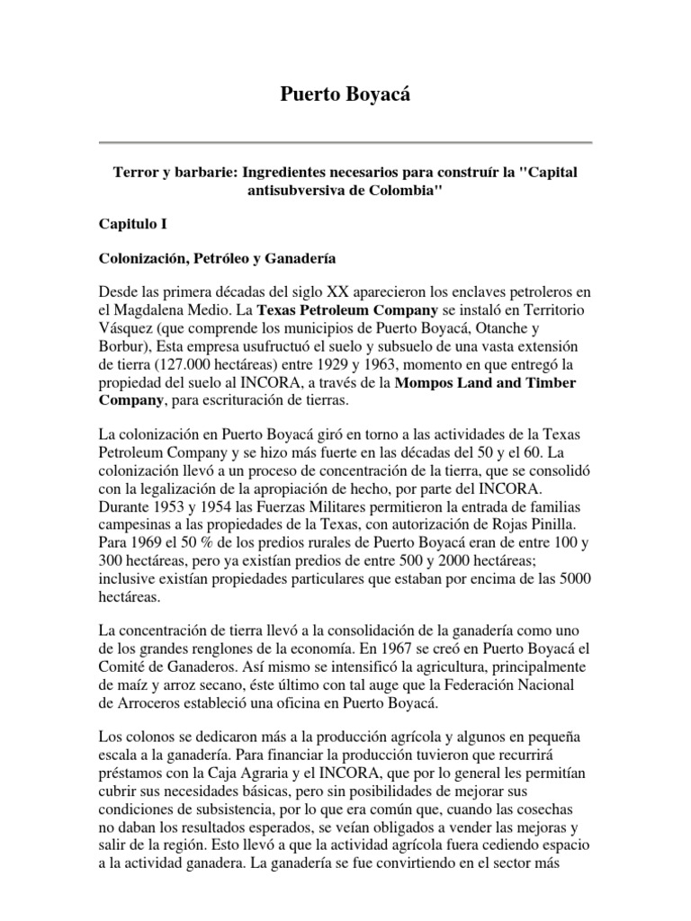 Terror y barbarie: Ingredientes necesarios para construr la "Capital antisubversiva de Colombia" Capitulo I Colonizacin, Petrleo y Ganadera Desde las primera dcadas del siglo XX aparecieron los enclaves petroleros en el Magdalena Medio. La Texas Petroleum Company se instal en Territorio Vsquez (que comprende los municipios de Puerto Boyac, Otanche y Borbur), Esta empresa usufructu el suelo y subsuelo de una vasta extensin de tierra (127.000 hectreas) entre 1929 y 1963, momento en que entreg la propiedad del suelo al INCORA, a travs de la Mompos Land and Timber Company, para escrituracin de tierras. La colonizacin en Puerto Boyac gir en torno a las actividades de la Texas Petroleum Company y se hizo ms fuerte en las dcadas del 50 y el 60. La colonizacin llev a un proceso de concentracin de la tierra, que se consolid con la legalizacin de la apropiacin de hecho, por parte del INCORA. Durante 1953 y 1954 las Fuerzas Militares permitieron la entrada de familias campesinas a las propiedades de la Texas, con autorizacin de Rojas Pinilla. Para 1969 el 50 % de los predios rurales de Puerto Boyac eran de entre 100 y 300 hectreas, pero ya existan predios de entre 500 y 2000 hectreas; inclusive existan propiedades particulares que estaban por encima de las 5000 hectreas. La concentracin de tierra llev a la consolidacin de la ganadera como uno de los grandes renglones de la economa. En 1967 se cre en Puerto Boyac el Comit de Ganaderos. As mismo se intensific la agricultura, principalmente de maz y arroz secano, ste ltimo con tal auge que la Federacin Nacional de Arroceros estableci una oficina en Puerto Boyac. Los colonos se dedicaron ms a la produccin agrcola y algunos en pequea escala a la ganadera. Para financiar la produccin tuvieron que recurrir prstamos con la Caja Agraria y el INCORA, que por lo general les permitan cubrir sus necesidades bsicas, pero sin posibilidades de mejorar sus condiciones de subsistencia, por lo que era comn que, cuando las cosechas no daban los resultados esperados, se vean obligados a vender las mejoras y salir de la regin. Esto llev a que la actividad agrcola fuera cediendo espacio a la actividad ganadera. La ganadera se fue convirtiendo en el sector ms
