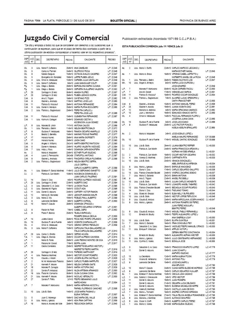 Qs. 4 Uca. Omar A. Velázquez 10-6-10 CARMEN JULIA SANTILLAN L.P. 22.549 Qs. 1 Uca. Reinaldo J. Bellini 29-6-10 FABIAN GUSTAVO LISE L.P. 22.647