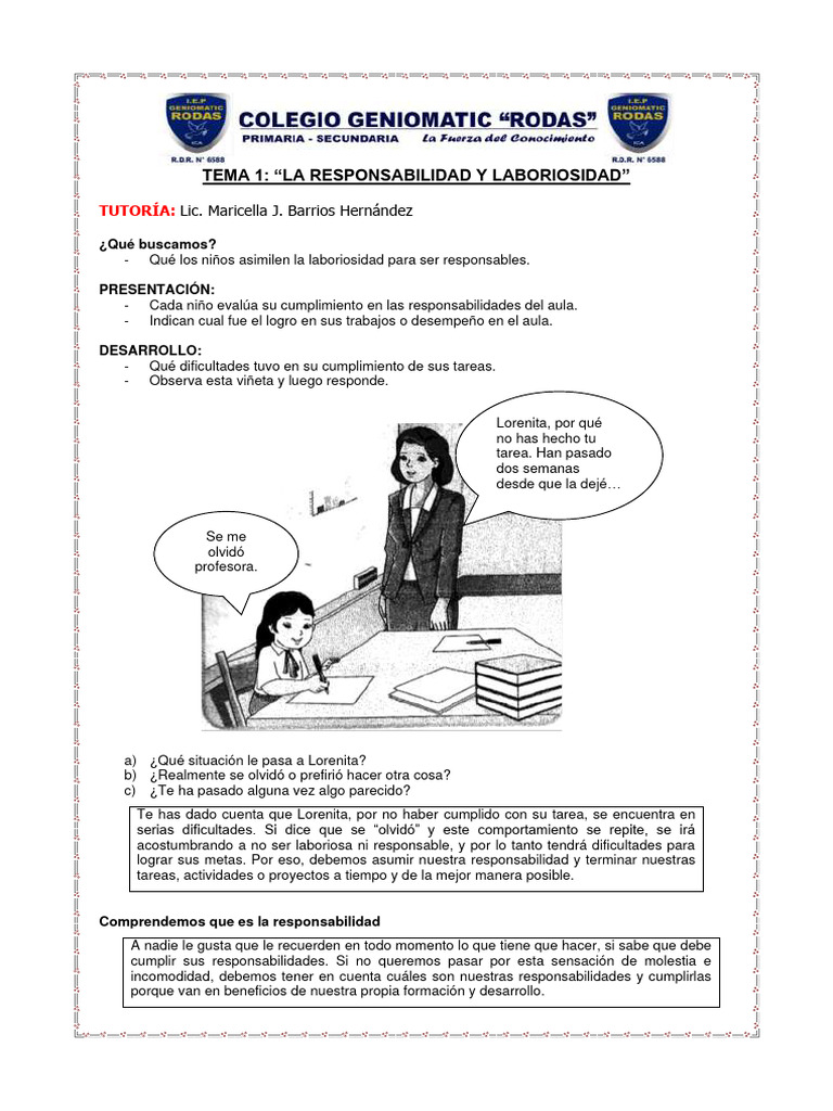 TEMA 1: “LA RESPONSABILIDAD Y LABORIOSIDAD”