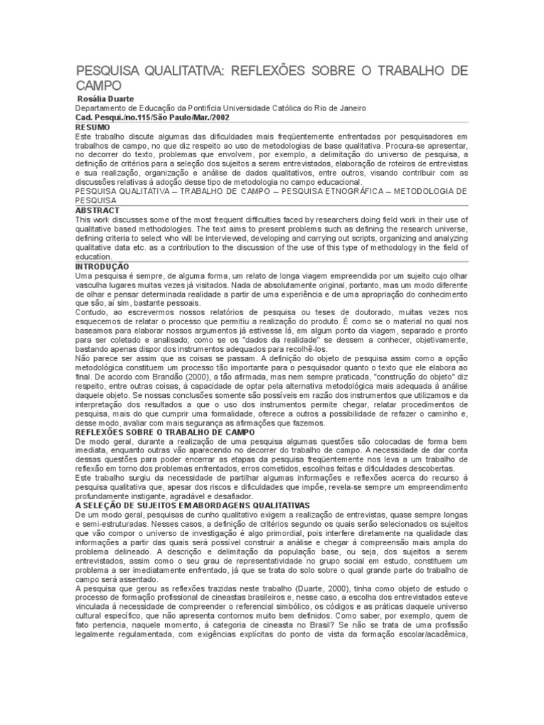 A pesquisa que gerou as reflexões trazidas neste trabalho (Duarte, 2000), tinha como objeto de estudo o