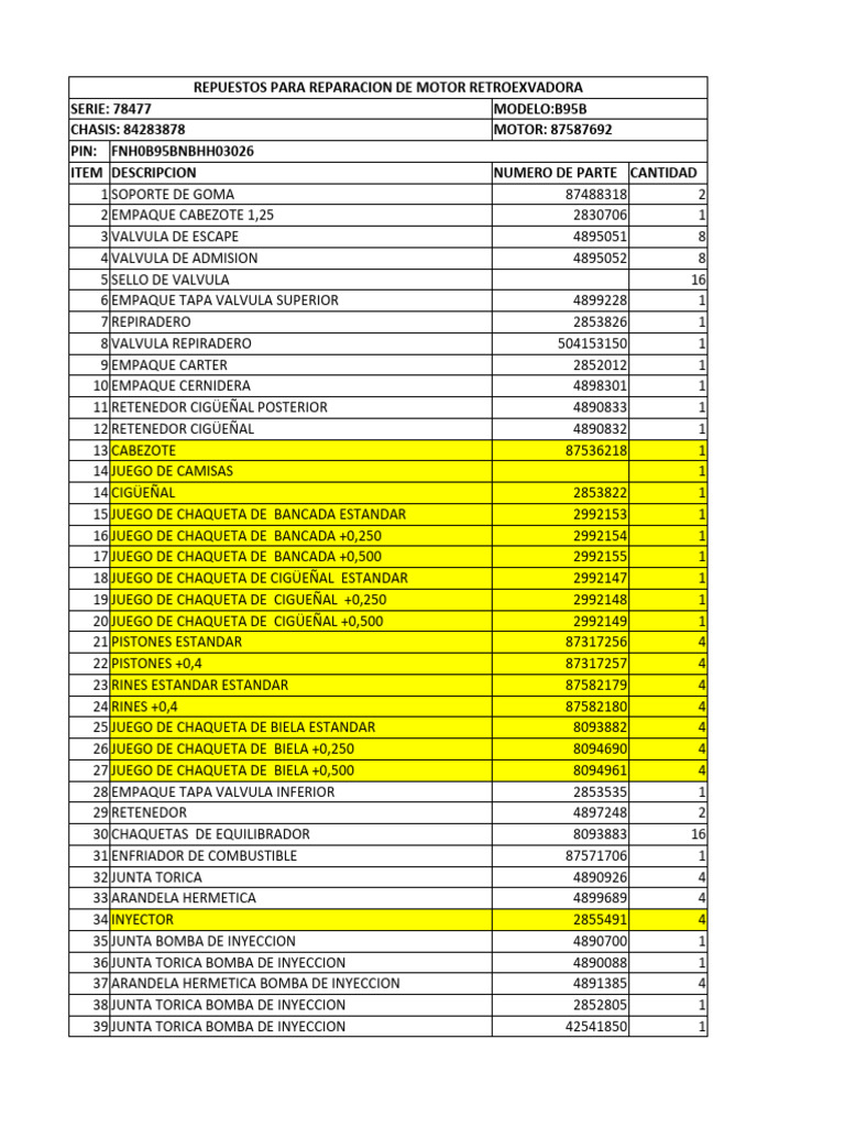 REPUESTOS PARA REPARACION DE MOTOR RETROEXVADORA