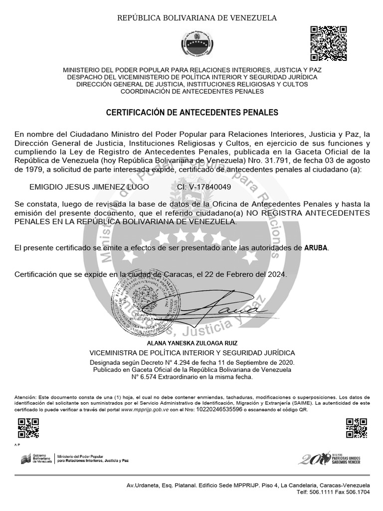 certificado lo puede verificar a través del portal www.mpprijp.gob.ve con el Nro: 10220246535596 o escaneando el código QR.
