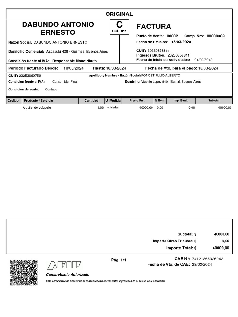 Razón Social: DABUNDO ANTONIO ERNESTO Fecha de Emisión: 18/03/2024