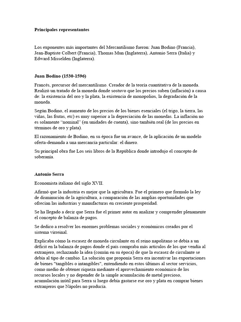 Los exponentes más importantes del Mercantilismo fueron: Juan Bodino (Francia),