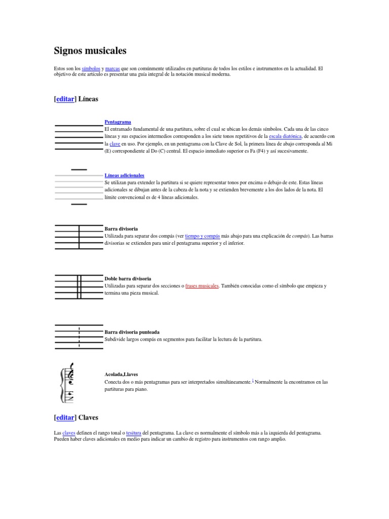 Estos son los smbolos y marcas que son comnmente utilizados en partituras de todos los estilos e instrumentos en la actualidad. El objetivo de este artculo es presentar una gua integral de la notacin musical moderna.
