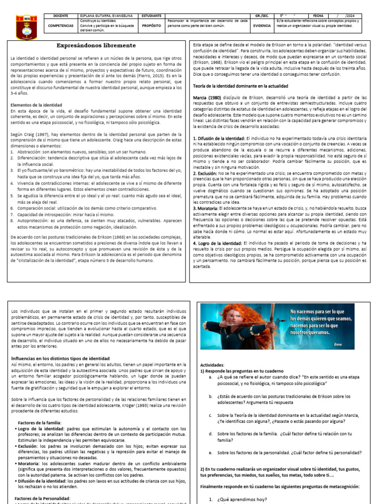adquisición de esta identidad y la autoestima asociada. Unos padres que sirvan de apoyo y 1) Responde las preguntas en tu cuaderno