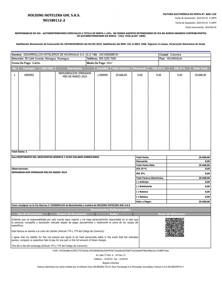 Nombre: DESARROLLOS HOTELEROS DE NICARAGUA S.A. C.C / Nit: J0310000066191 Ciudad: Colombia
