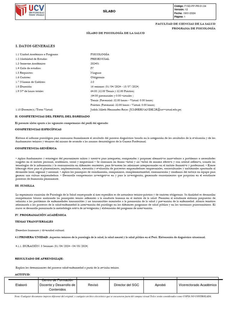 Silabo - PSICOLOGÍA DE LA SALUD