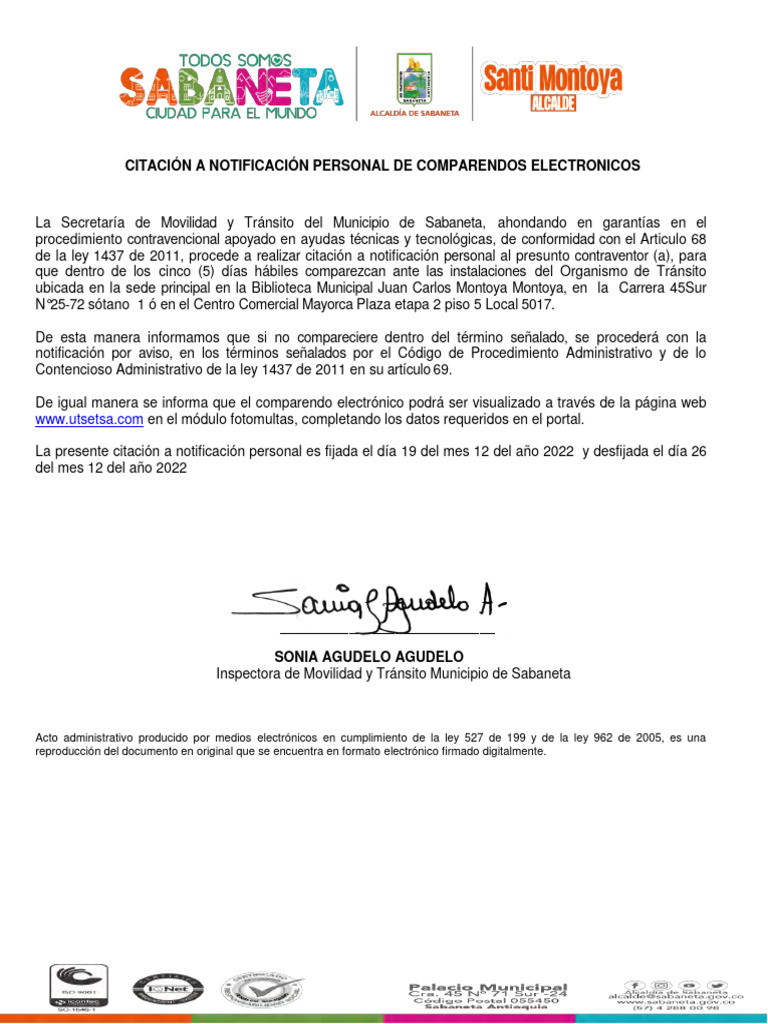 Citación A Notificación Personal de Comparendos Electronicos