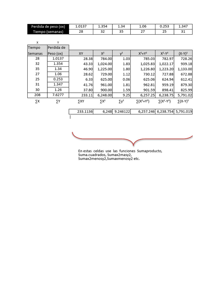 Semanas Peso (ox) XY X2 y2 X2+Y2 X2-Y2 (X-Y)2