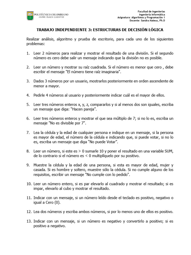 TRABAJO INDEPENDIENTE 3: ESTRUCTURAS DE DECISIÓN LÓGICA