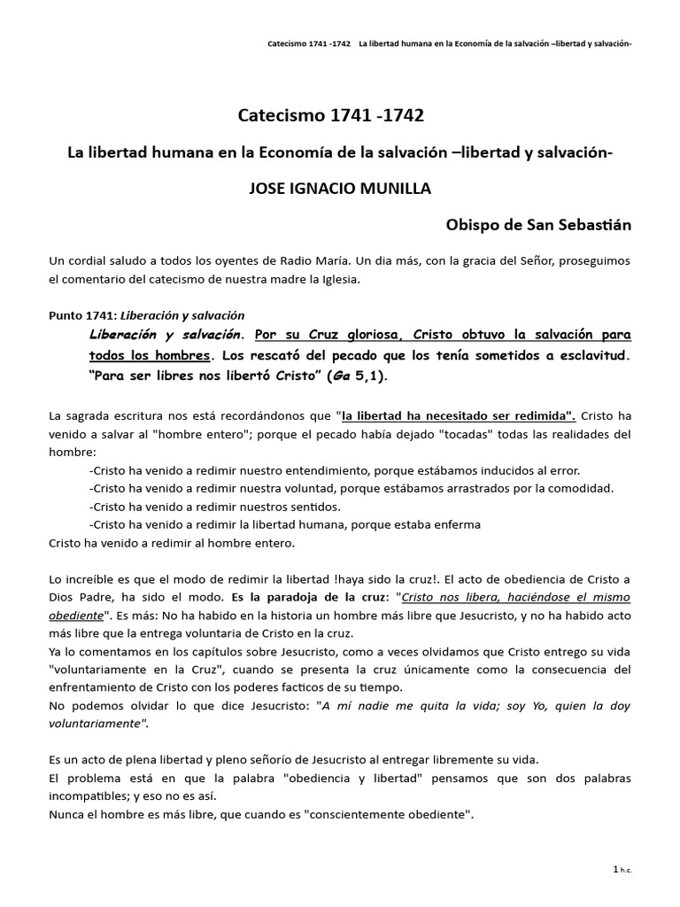 Catecismo 1741 -1742 La libertad humana en la Economía de la salvación –libertad y salvación-