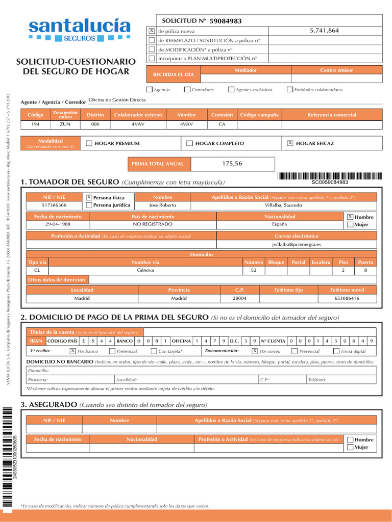 1. TOMADOR DEL SEGURO (Cumplimentar con letra mayúscula) SC0059084983