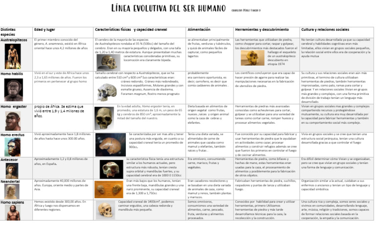 Distintas Edad y lugar Características físicas y capacidad craneal Alimentación Herramientas y descubrimiento Cultura y relaciones sociales