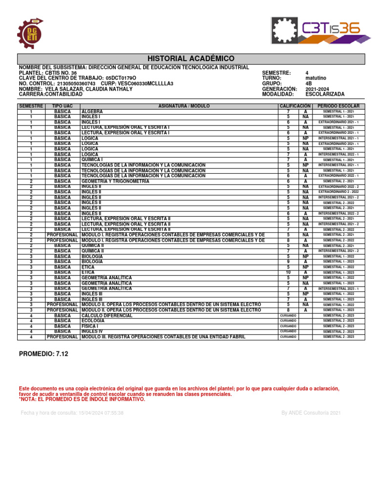 NOMBRE: VELA SALAZAR, CLAUDIA NATHALY GENERACIÓN: 2021-2024