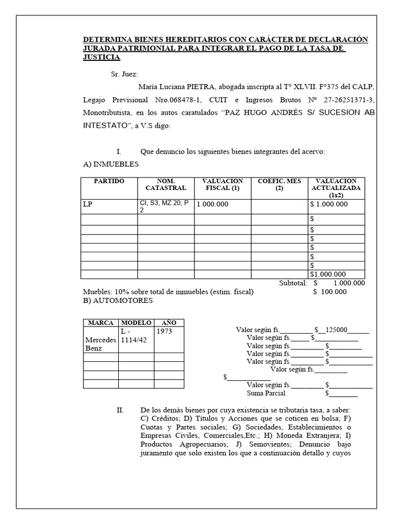 la tasa de justicia conforme a la presente declaración jurada patrimonial,