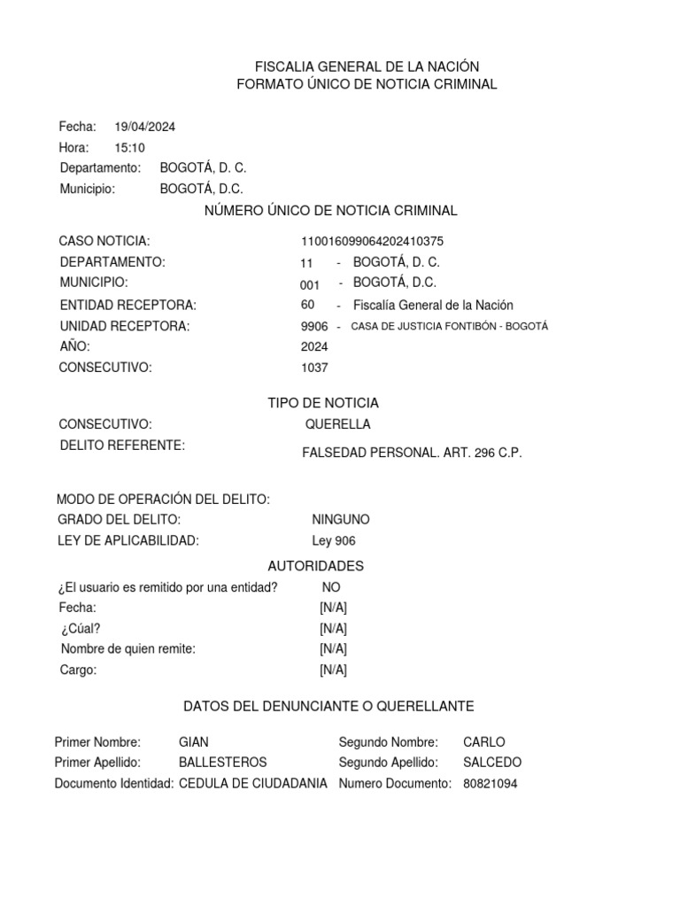 FORMATO ÚNICO DE NOTICIA CRIMINAL