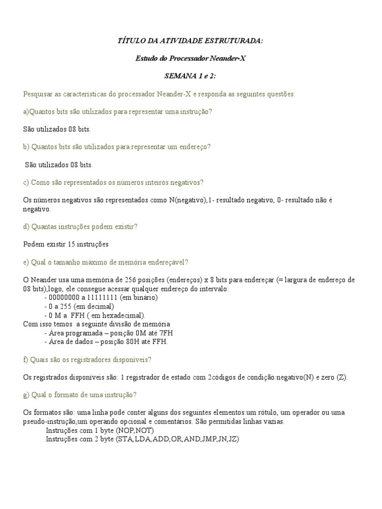 PRODUTO/RESULTADO: O resultado desta atividade ser um relatrio composto pelos resultados parciais de cada semana. Cite todas as referncias utilizadas. O NEANDERX um computador muito simples, desenvolvido apenas para fins didticos. Processadores modernos so muito mais complexos que NEANDERX. Entretanto, mesmo processadores utilizados nas mais sofisticadas estaes de trabalho so baseados nos conceitos elementares que voc aprendeu com NEANDERX. O NEANDERWIN estende o conjunto de instrues do NEANDER e oferece uma interface de programao amigvel, com a entrada do cdigo em representao simblica, com diversas facilidades para o programador, que tornam muito mais fcil o uso do processador NEANDER como ferramenta de ensino. Esto disponveis verses tanto para o sistema operacional Windows e Linux. O cdigo fonte est disponvel mediante solicitao.