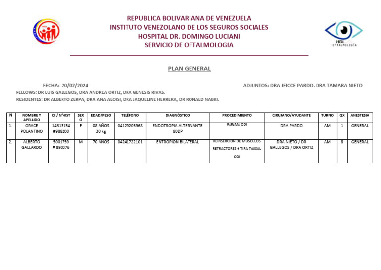 N NOMBRE Y CI / N°HIST SEX EDAD/PESO TELÉFONO DIAGNÓSTICO PROCEDIMIENTO CIRUJANO/AYUDANTE TURNO QX ANESTESIA