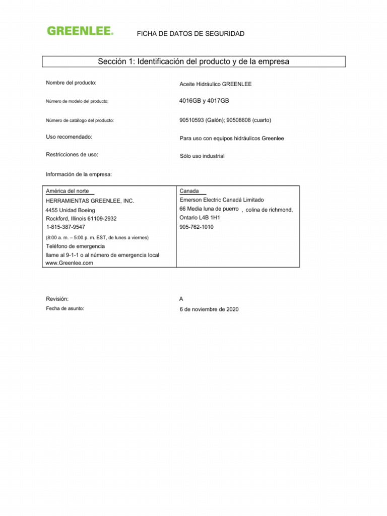Nombre del producto: Aceites hidráulicos GREENLEE